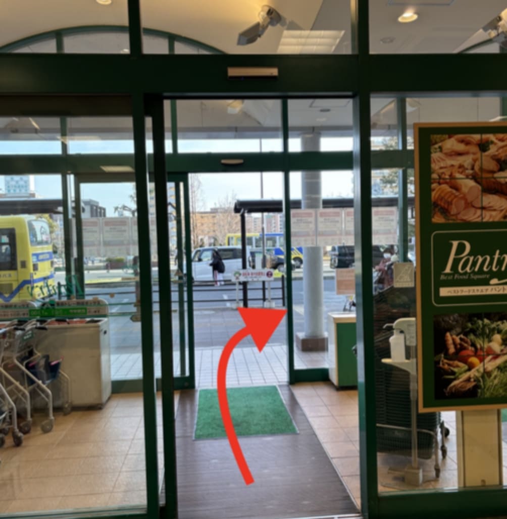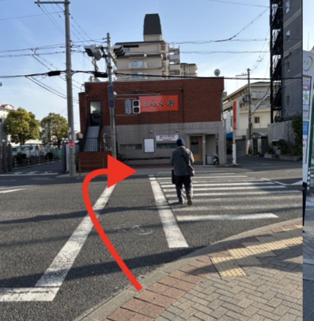 住道駅東出口から出てエスカレーターで降ります。エスカレーターを降りて左に曲がり出口を出ます。出口を出て右に曲がります。
